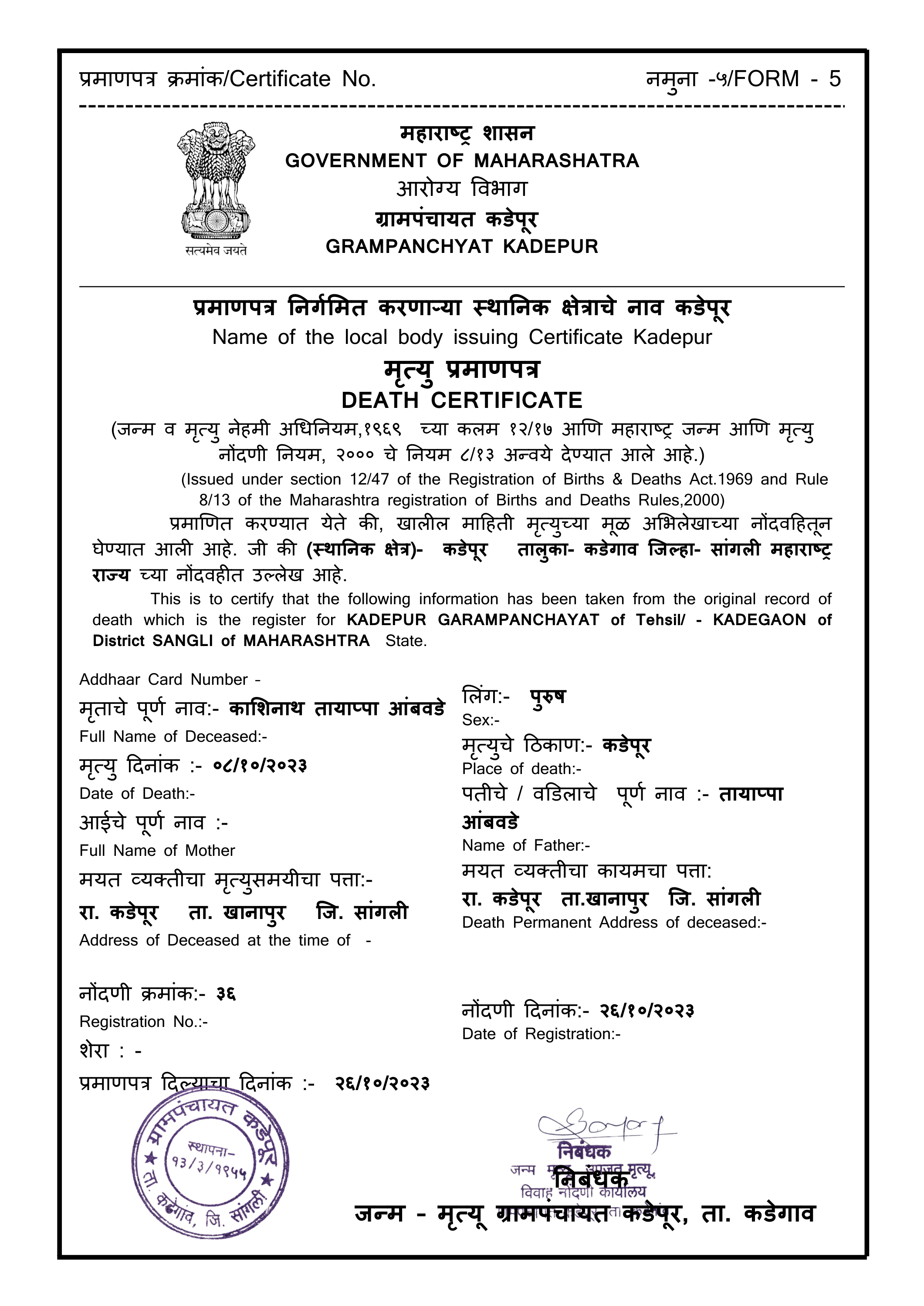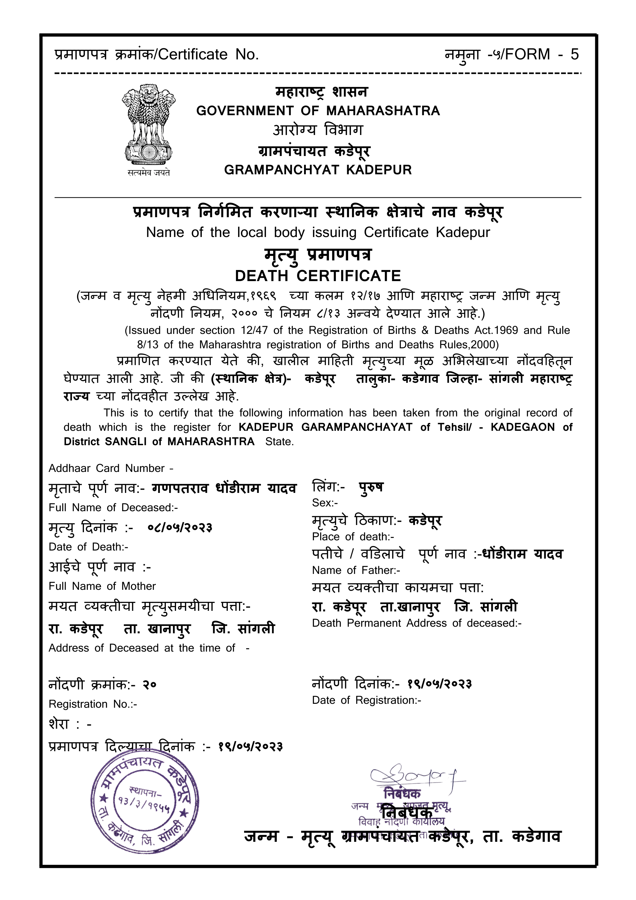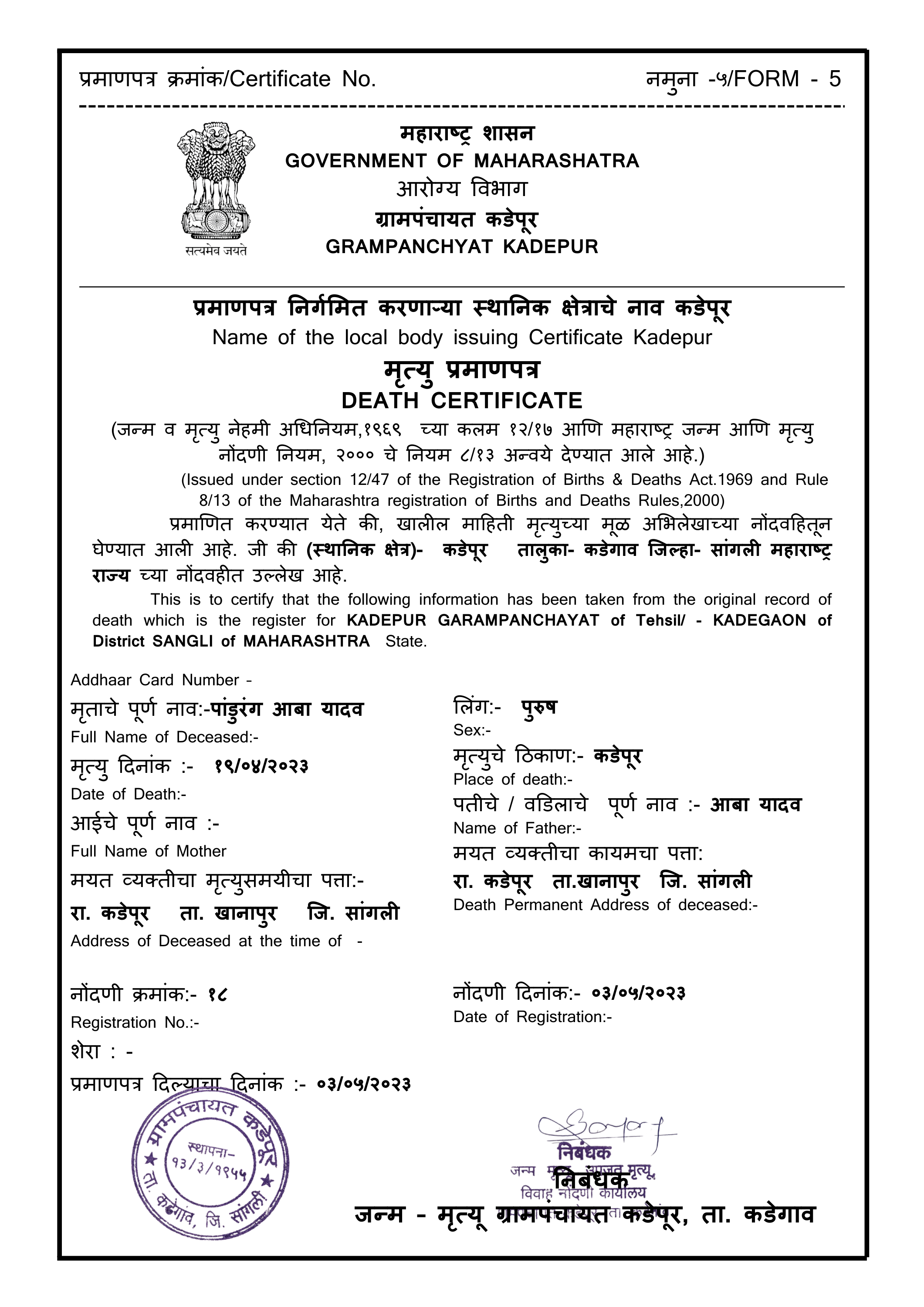 आपण मृत्यू प्रमाणपत्रा साठी खाली दिलेल्या ऑनलाइन फॉर्म मध्ये अर्ज करू शकता. त्यासाठी कृपया अगोदर 20/- अर्जाची फी ऑनलाइन प्रणाली द्वारे येथे दिलेला QR कोड स्कॅन करून अदा करावी व त्याचा स्क्रीनशॉट काढून ठेवा. सोबत येणारा UTR नंबर देखील कॉपी करून ठेवा. आपणास फॉर्म भरतांना स्क्रीनशॉट व UTR नंबर भरणे अनिवार्य आहे.