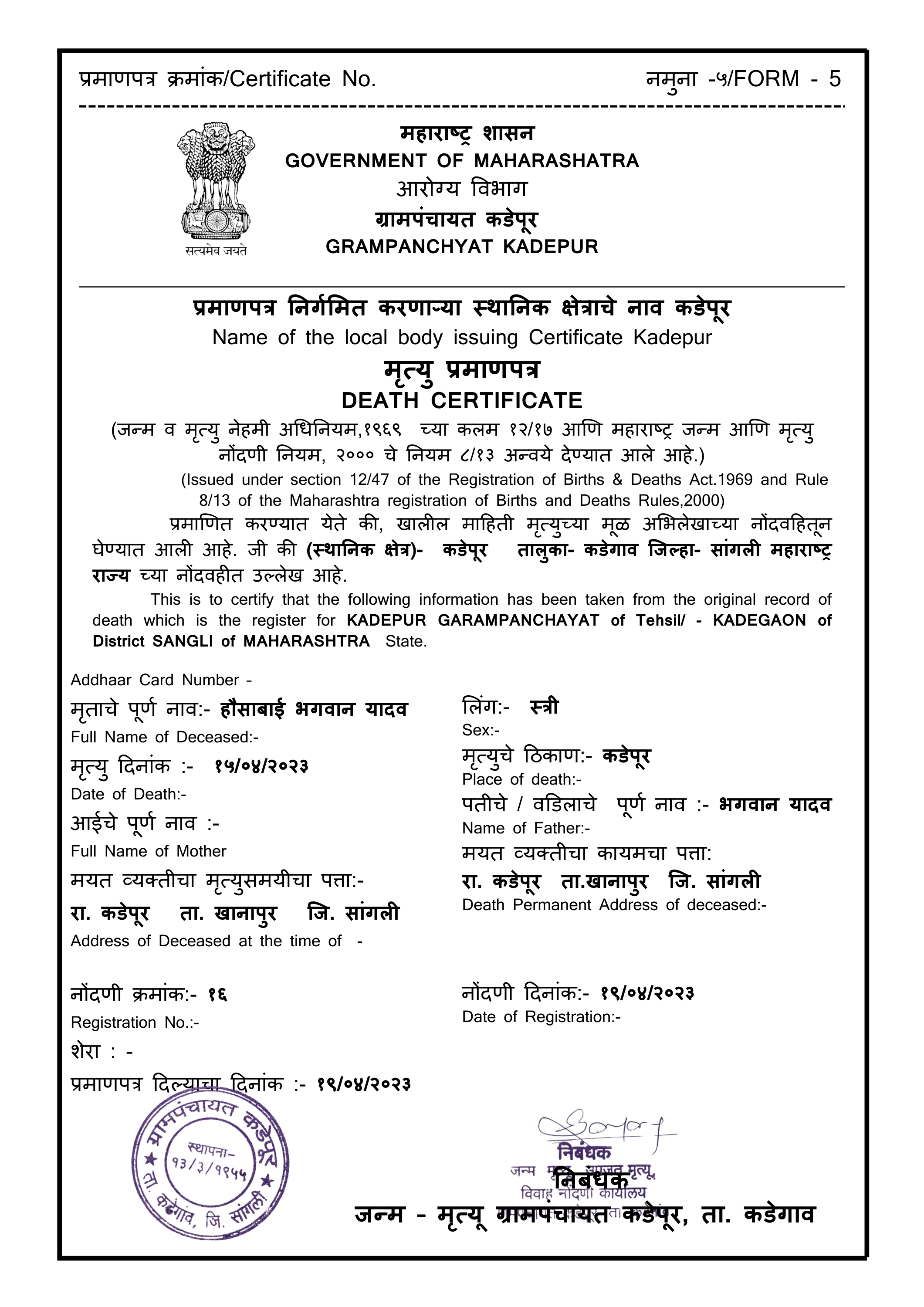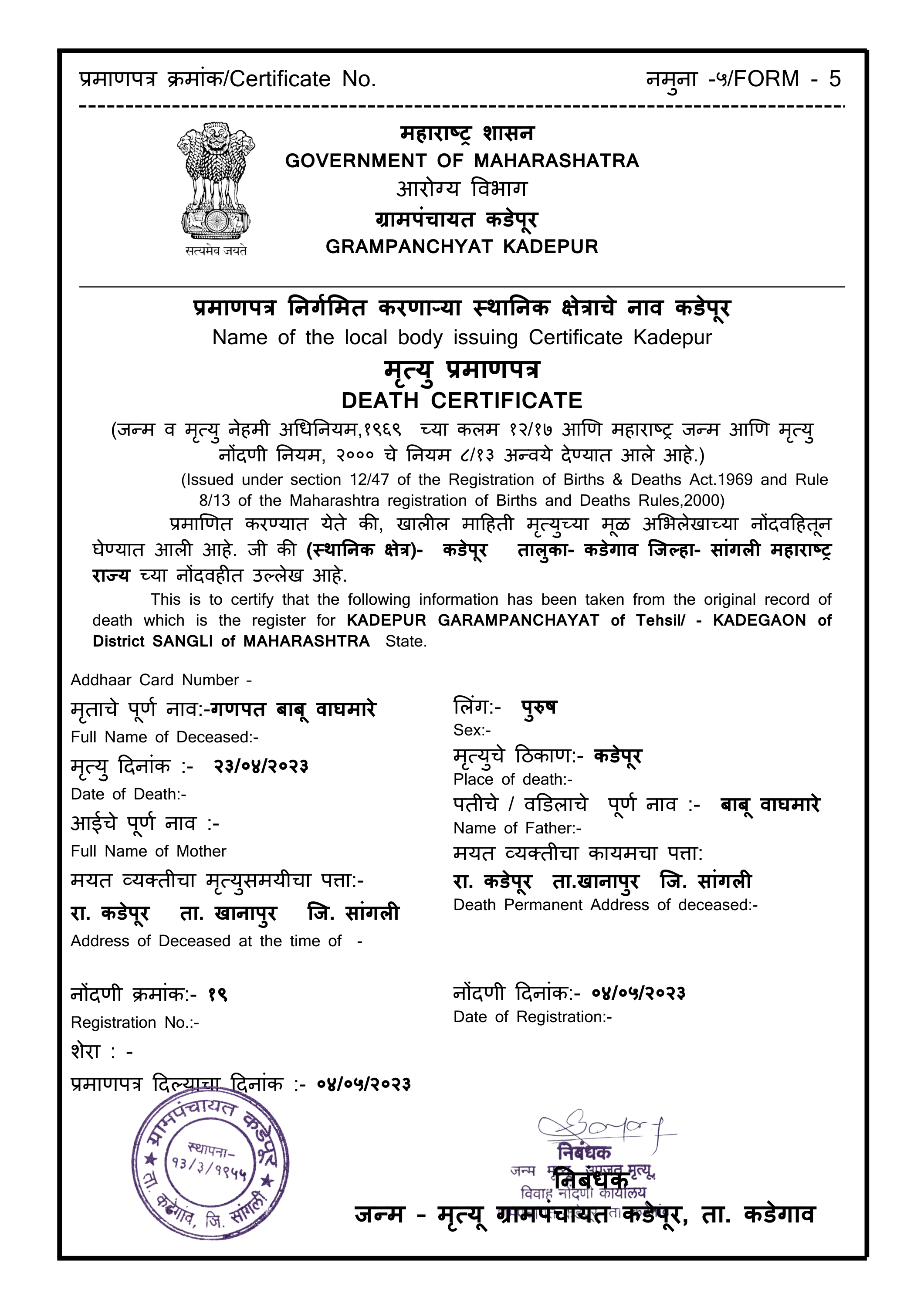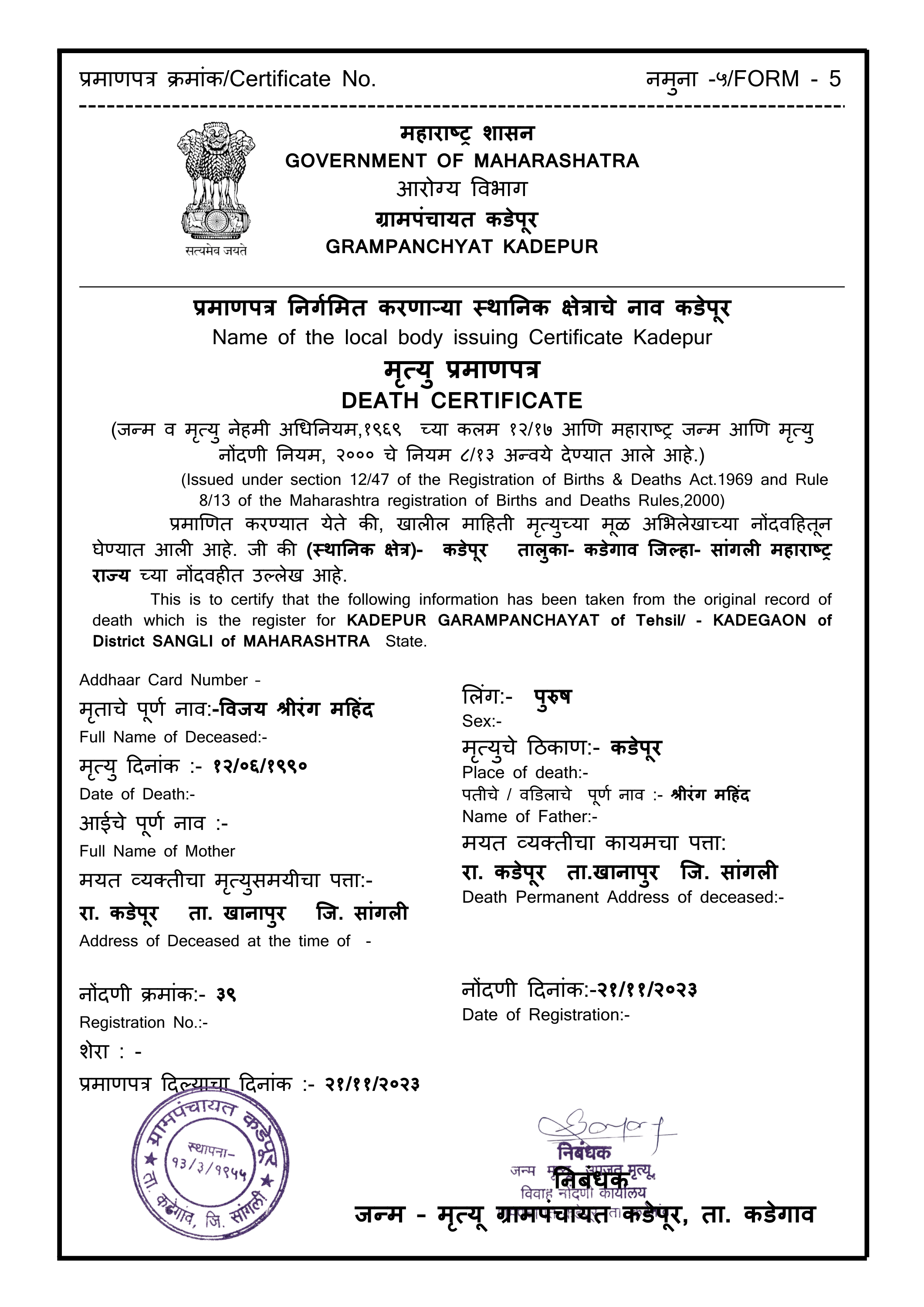 आपण मृत्यू प्रमाणपत्रा साठी खाली दिलेल्या ऑनलाइन फॉर्म मध्ये अर्ज करू शकता. त्यासाठी कृपया अगोदर 20/- अर्जाची फी ऑनलाइन प्रणाली द्वारे येथे दिलेला QR कोड स्कॅन करून अदा करावी व त्याचा स्क्रीनशॉट काढून ठेवा. सोबत येणारा UTR नंबर देखील कॉपी करून ठेवा. आपणास फॉर्म भरतांना स्क्रीनशॉट व UTR नंबर भरणे अनिवार्य आहे.